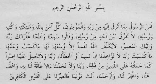 “O peygamber kendisine Rabbinden indirilene îman etti, mü’minler de. (Onlardan) her biri Allah’a, O’nun meleklerine, kitaplarına, peygamberlerine inandılar. ‘Onun (Allah ’ın) peygamberlerinden hiç birini diğerlerinin arasından ayırmayız, (hepsine inanırız). Dinledik, (kabul ettik, emrine) itaat ettik. Ey Rabbimiz, mağfiretini (isteriz). Son varışımız ancak Sanadır. ’ dediler.