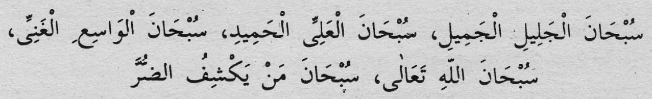 Türkçe Okunuşu: Sübhânel celîlil cemili, sübhânel aliyyil hamîdi, sübhânel vâsi’il ganiyyi, sübhânallahi teâlâ, sübhâne men yekşifu ’d-durre. Türkçe Anlamı: Celil ve cemil olan, yüce ve…