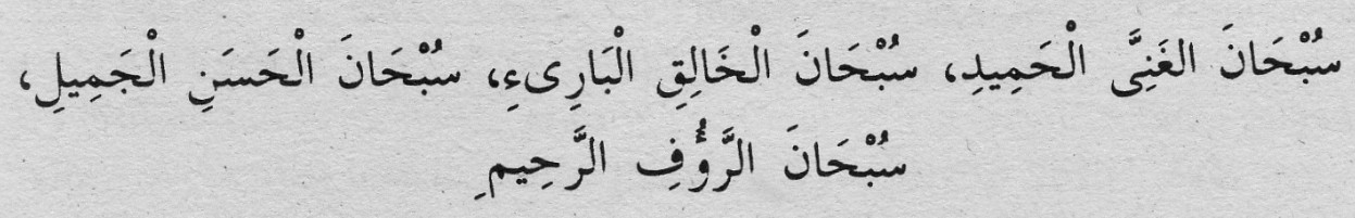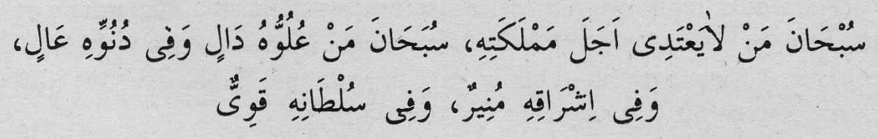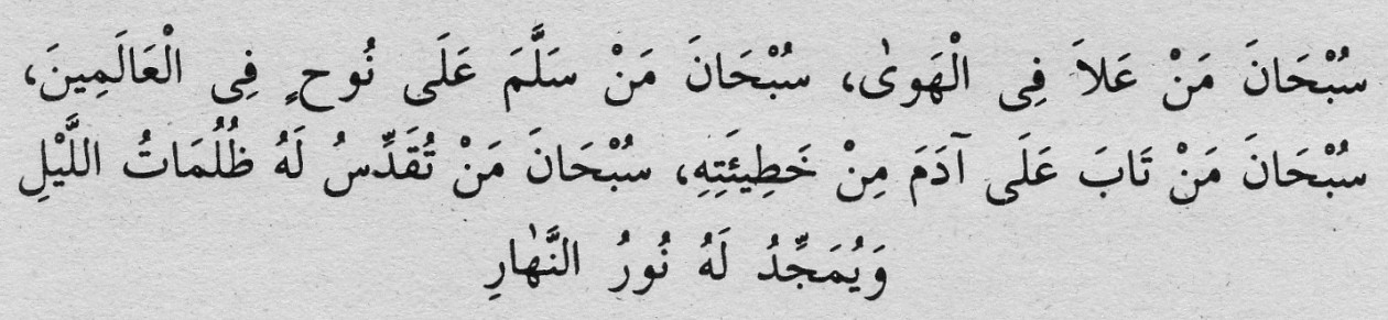 Türkçe Okunşu: Sübhane men alâ filhavâ, sübhâne men selleme alâ Nûh ’in fil âlemin, sübhâne men tâbe alâ Âdem ’e min hatietihi, sübhâne men tukaddisü…