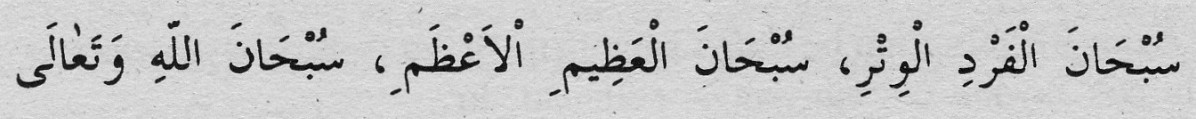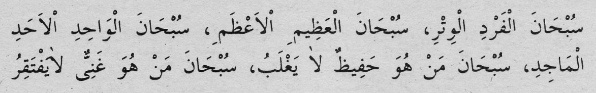 Türkçe Okunuşu: Sübhânel ferdil vitri, sübhânel azîmil a’zami, sübhânel vâhidil-ahadil-mecidi, sübhâne men hüve hafızun lâ yağlebü, sübhâne men hüve ganiyyün lâ yeftekiru. Türkçe Anlamı: Tek…