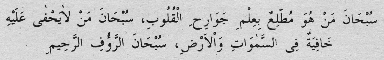 Türkçe Okunuşu: Sübhâne men hüve muttaliun bi ilmi cevârihil kulûbi, sübhâne men lâ yahfâ aleyhi hâfiyetün fissemavâti vel ardi, sübhâne’r-raûfur’-rahîm.