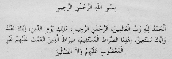 “Rahman ve Rahim olan Allah’ın adıyla. Hamd olsun âlemlerin Rabbi, Rahman, Rahîm, din gününün (tek) sahibi ve mutasarrıfı Allah ’a. Yalnız Sana ibadet ederiz, yalnız Senden yardım isteriz. Bizi doğru yola, kendilerine nimet verdiklerinin yoluna ilet; gazaba uğrayonlarınkine, sapıklarınkine değil.” (43) Fatiha, 1-7.