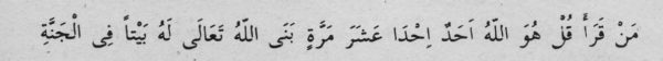 “Kim ki Kulhüvallahü ahad sûresini onbir defa okursa Allahü Teâlâ o kimseye cennette bir köşk bina eder. ” Hz. Ömer: “Yâ Resûlullah, ihlası fazla okuyanın demek ki fazla köşkleri olacaktır.” dedi. Peygamberimiz de: “Allah’ın rahmeti sonsuzdur ve O’nun köşkleri çoktur. ”