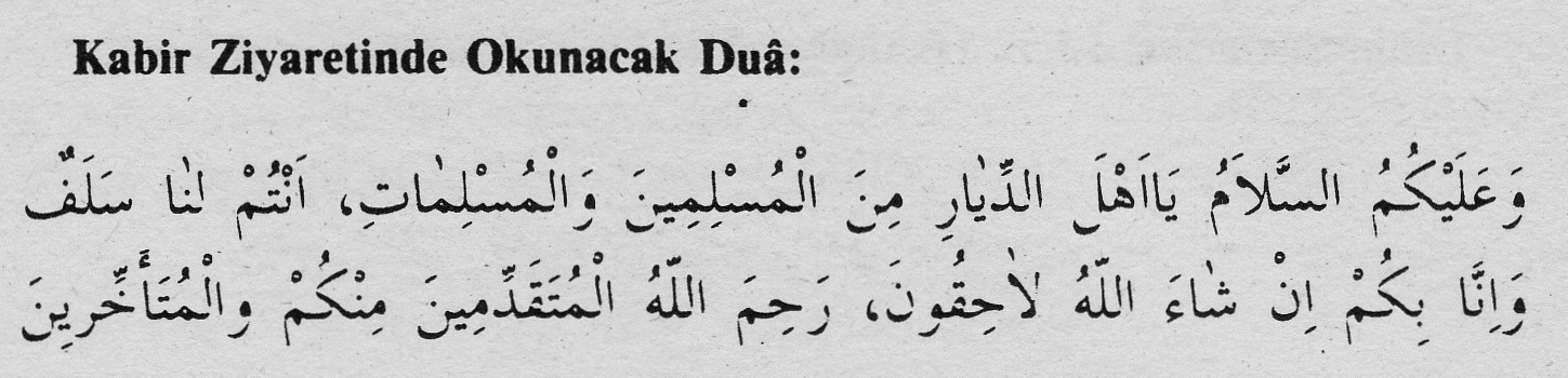 “Selâm sizin üzerinize olsun, ey kadın ve erkek müslümanların diyarı halkı. (Yani ey kabristan ehli.) Siz bizden öncesiniz, biz de inşallah size kavuşacağız. Allah sizden önce gidenlere ve arkada kalanlara rahmet eylesin.