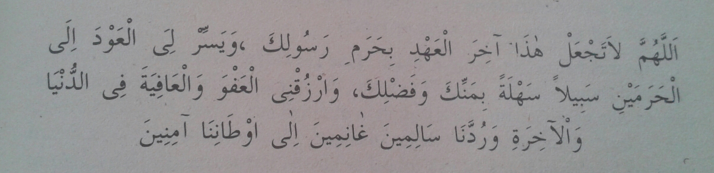 Allahumme la tec’al haza ahirel ahdş biharemi resulike, ve yessirli el-avde ilel harameyni sebilen sehleten bimennike ve fazlike, verzukni el-afve vel afiyete fidünya vel ahireti, ve ruddena salimine ganimine illa evtanina aminine.