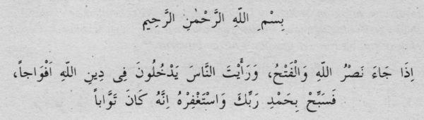“Allah’ın nusreti ve fetih gelince, sen de insanların fevc fevc Allah’ın dinine gireceklerini görünce, hemen Rabbini hamd ile teşbih (ve tenzih) et. O’nun yarlığamasını iste. Şüphesiz ki O, tevbeleri çok kabul edendir.’’ (46) Nasr, 1-3.