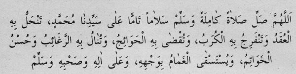 (Allahumme salli salâten kâmileten ve sellim selâmen tâmmen alâ seyyi-dinâ Muhammedin tenhallü bihil ukadü ve tenfericü bihil kürebü ve tükdâ bihil havâicü ve tünâlü bihirreğâibü ve hüsnül havâtimi ve yüsteskal gamâ-mü bivechihi ve alâ âlihi ve sahbihi ve sellim.)
