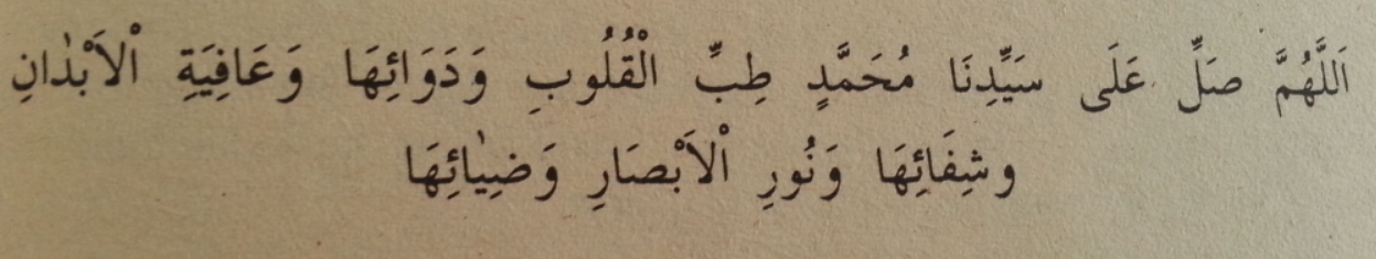 Allahumme salli alâ seyyidinâ Muhammedin tıbbıl kulûbi ve devâiha ve âfiyetil ebdâni ve şifâiha ve nûril ebsâri ve ziyâiha.