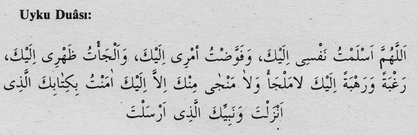 Allahumme eslemtü nefsi ileyke, ve fevveztü emri ileyke, ve elce’tü zahrî ileyke, rağbeten ve rehbeten ileyke, lâ melce’e velâ mencâ minke illâ ileyke, âmentü bikitâbikellezî enzelte ve nebiyyike’llezî erselte.